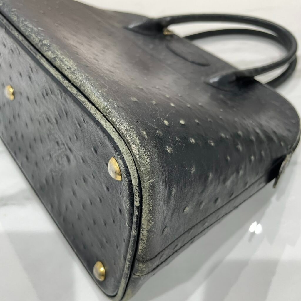 オーストリッチ特有のクイルマーク(粒)も乾燥でくすみ、角部分の摩擦ダメージが目立っていました。