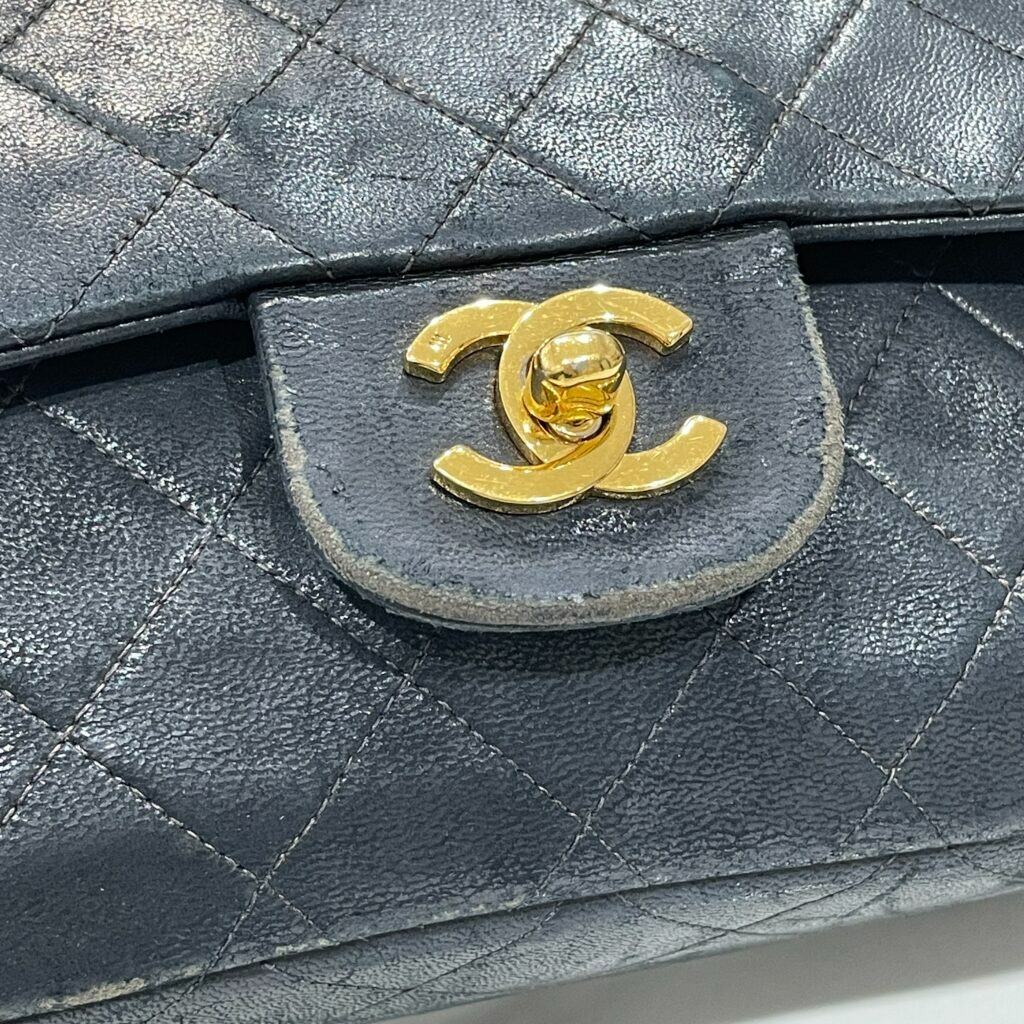 革の潤いと深みが戻り、全体が均一なブラックへ。クイルマークの立体感も蘇り、自然で上品なツヤを取り戻しました。